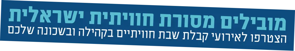 בכל יום שישי אירועי קבלת שבת סוחפים ומלאי כיף והשראה.מוזמנים להצטרף לחוויית שישי עם פעילויות והפעלות מגוונות המחברות את כולנוהירשמו עכשיו לקבוצות הוואטסאפ האזוריות וקבלו עדכונים אונליין על האירועים הקרובים לבתיכםהכניסה ללא עלות, מותנה בהרשמה מראשמחכים לכם 👋